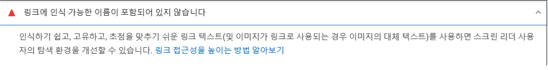 이 경고는 주로 스크린 리더 사용자의 탐색 환경을 개선하기 위한 것으로, 웹 접근성 측면에서 매우 중요합니다. 스크린 리더는 시각적 요소 대신 “링크 설명” (link description)을 읽어주는데, 이것이 없으면 사용자는 해당 링크가 어디로 연결되는지 알 수 없습니다.