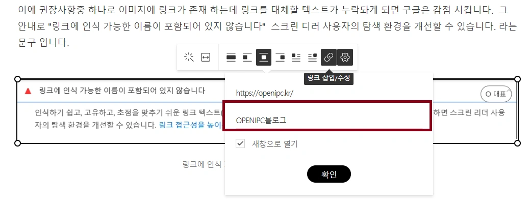 티스토리 블로그의 경우, 이미지 상단의 링크 부분에 대체 텍스트를 입력하는 란이 있습니다. 그곳에 링크의 목적을 명확히 설명하는 텍스트를 입력해주시면 됩니다.