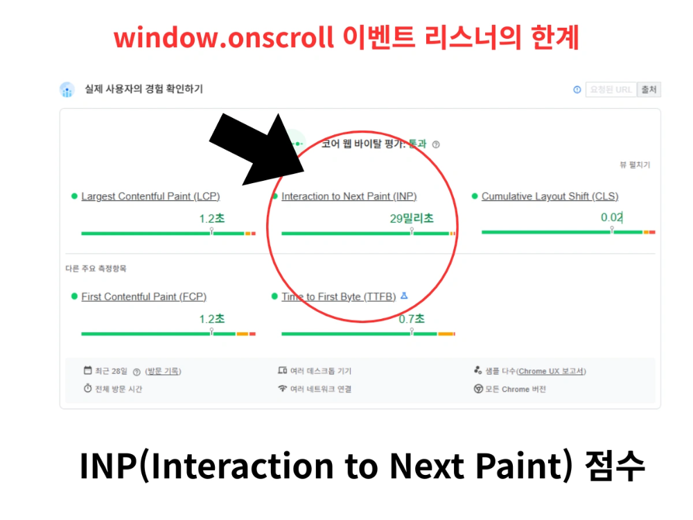 빈번한 스크롤 이벤트 처리가 메인 스레드를 장시간 점유하게 되면, 블로그 응답 속도가 저하되고 FID(First Input Delay)는 물론, INP(Interaction to Next Paint) 점수가 악화됩니다. 메인 스레드 블로킹은 사용자 상호작용에 대한 응답을 지연시키는 장기 실행 작업(Long Task)을 유발하며, 이는 INP의 권장 임계값(300ms)을 쉽게 초과하게 만듭니다.