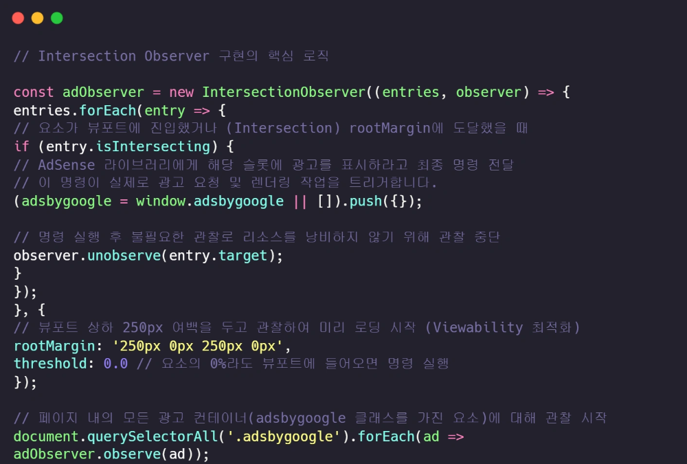 원래 즉시 실행되던 광고 요청 및 렌더링 명령인 (adsbygoogle = window.adsbygoogle || []).push({});를 자바스크립트 함수 내부로 캡슐화하고,Intersection Observer의 콜백 함수에서만 실행되도록 엄격히 제어합니다. 이로써 광고 스크립트의 무거운 실행 작업을 페이지 로딩 초기 단계에서 지연(Offloading)시켜 메인 스레드의 부하를 줄입니다. 이는 초기 성능 지표를 크게 개선합니다.