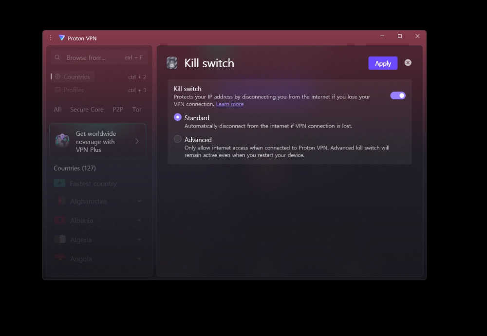 - 킬 스위치(Kill Switch) 활성화: VPN 연결이 일시적으로 끊길 때 내 실제 IP가 노출되는 것을 즉시 차단하여 사이트로부터 블랙리스트에 오르는 것을 방지합니다.