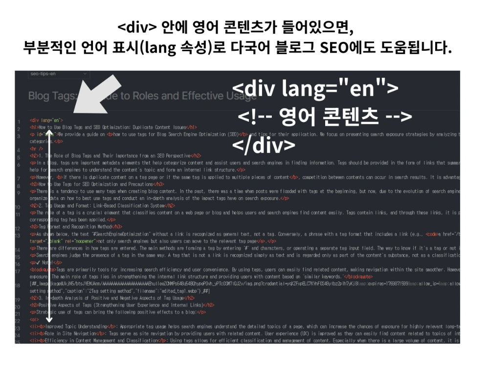 - 효과: 구글 봇이 페이지 내의 부분적인 언어 변화를 감지하여 텍스트 분석의 정확도를 높입니다.