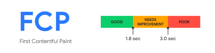 - FCP (First Contentful Paint): Measures the time it takes for the first content (text, image, etc.) to be displayed on the screen when accessing a web page. This is the first point at which a user perceives that the page is loading.