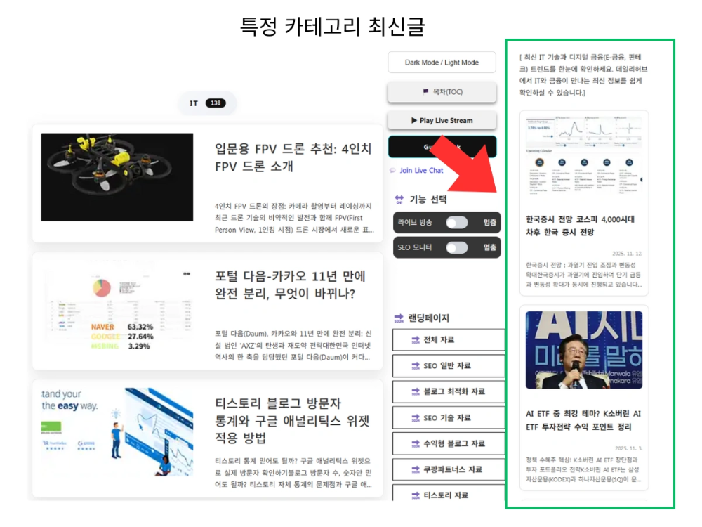 - 방문자 체류 시간(Duration Time) 증가: 관련 카테고리의 최신글을 보여줌으로써 클릭을 유도합니다.