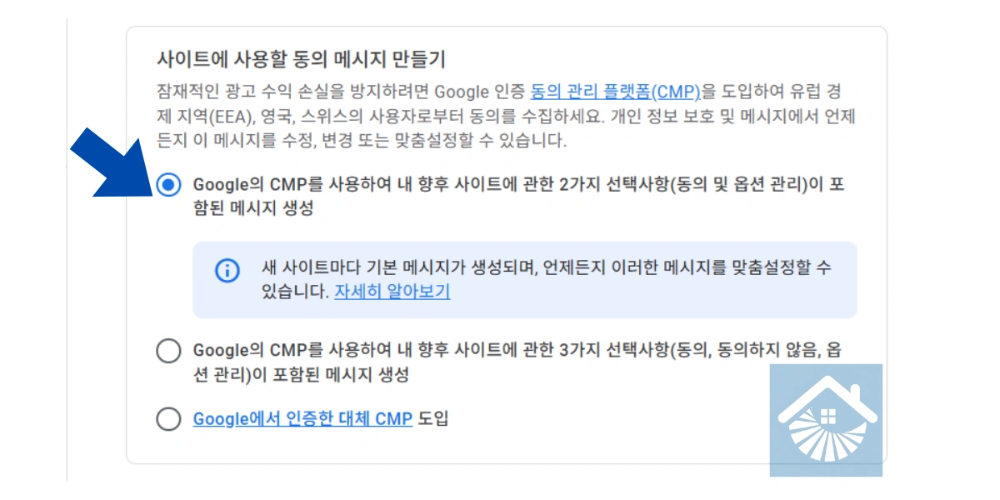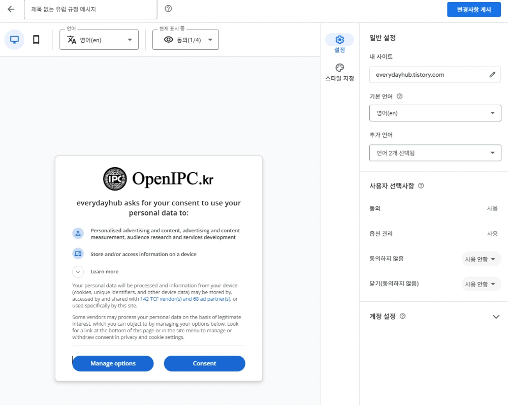 애드센스 관리 화면 최하단에서 동의 메시지를 만들 때, ‘동의 및 옵션 관리’가 포함된 2가지 선택사항 방식을 추천합니다. ‘거부’ 버튼이 메인에 바로 보이는 3가지 방식보다 실제 동의율이 약 25% 이상 높게 나타났습니다.