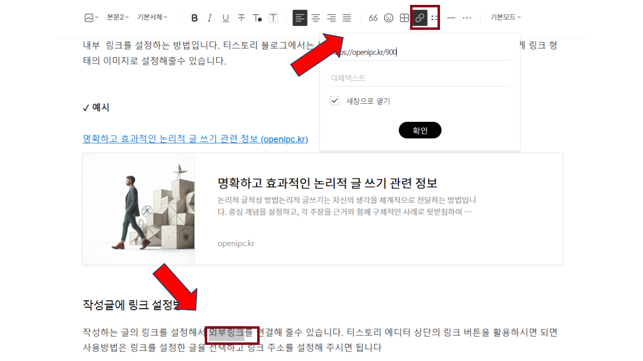You can connect external links by setting them up within the post you are writing. For Tistory, just use the link button at the top of the editor. To use it, select the text you want to set a link for and configure the link address.