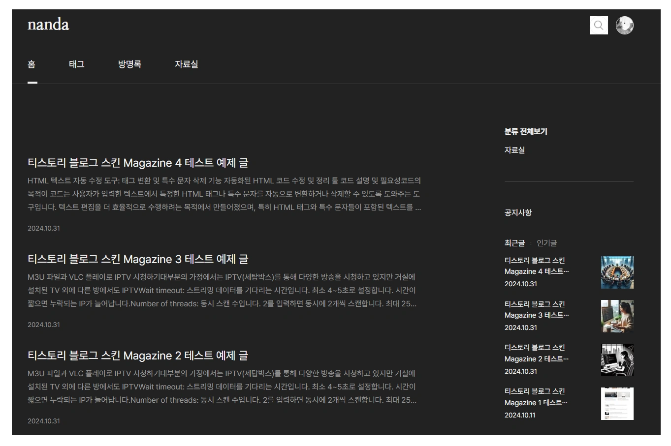 당신의 콘텐츠가 가장 빛날 수 있는 어둠, 블랙 테마로 블로그의 가치를 높이세요.