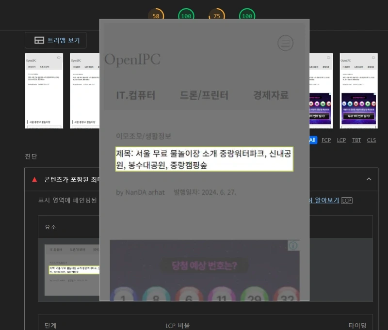 LCP 최적화를 위해서는 내 페이지에서 무엇이 가장 큰 비중을 차지하는지 알아야 합니다. 대부분의 티스토리 블로그에서는 글 제목이나 상단의 대표 이미지(썸네일)가 LCP 요소가 됩니다.