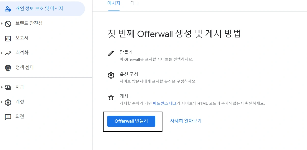 애드센스 계정에 로그인한 후 구글 개인 정보 보호 및 메시지 관리 섹션으로 들어갑니다. 여기서 ‘새 메시지 만들기’를 클릭하여 Offerwall 설정을 시작합니다.