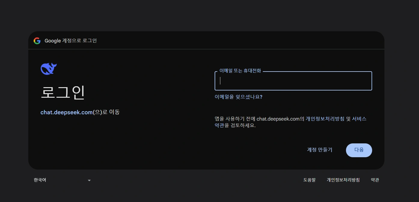 딥시크 공식 사이트에 접속하여 구글 계정 등으로 간편하게 로그인할 수 있습니다. Start Now 버튼을 통해 즉시 대화를 시작할 수 있습니다.