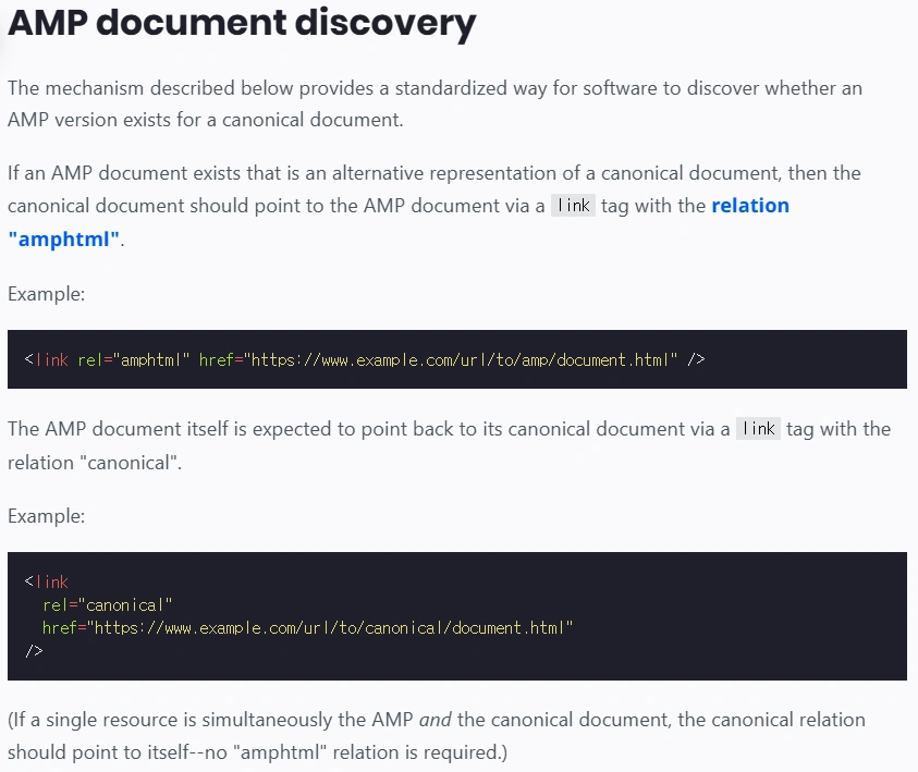 검색 엔진이 원본 페이지와 AMP 페이지의 관계를 이해할 수 있도록 CANONICAL 링크 설정을 정확히 해야 합니다.