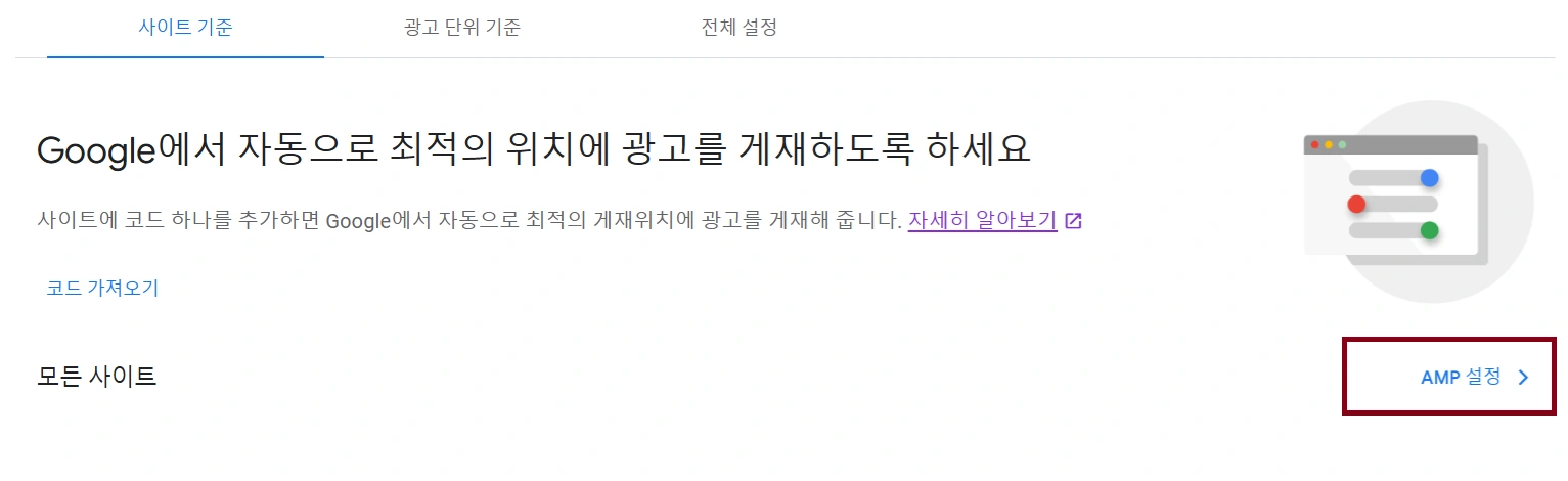 - 2. AMP 사이트 설정 선택 및 자동 광고 사용 활성화