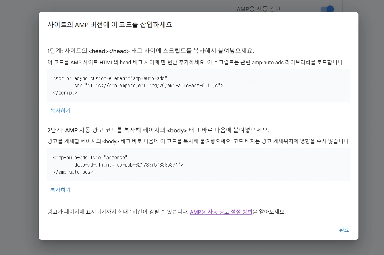 - 3. 제공되는 AMP 전용 스크립트 코드를 복사하여 head 및 body 태그 내부에 정확히 삽입