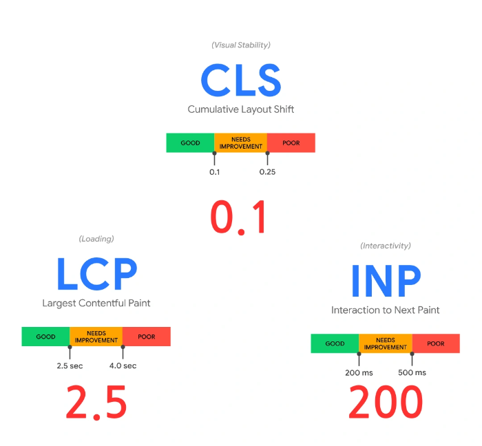 - INP (Interaction to Next Paint): (2024년 3월 12일부터 FID를 대체) 사용자가 페이지와 상호 작용(클릭, 탭 등)했을 때, 브라우저가 다음 프레임을 표시하는 데 걸리는 응답 시간을 측정합니다. 200밀리초(ms) 이내여야 ‘Good’ 평가를 받습니다.