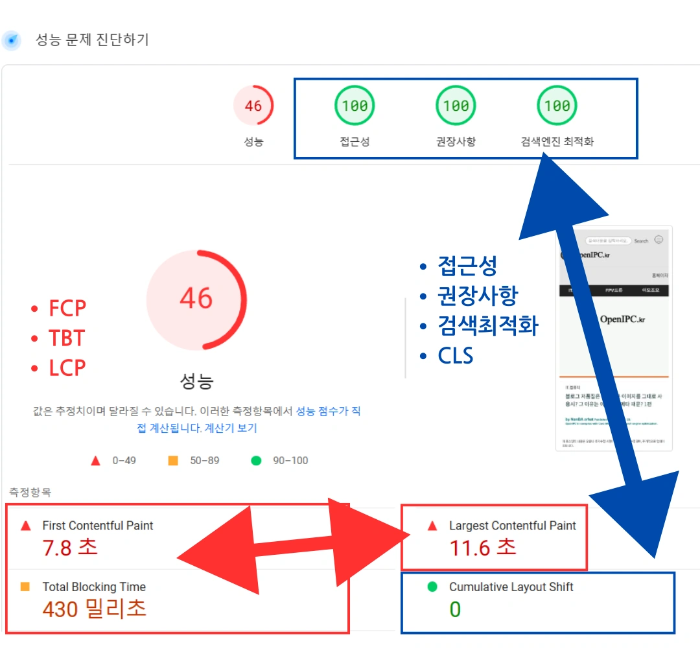 접근성, 권장 사항, 검색 최적화는 반드시 고득점을 받아야 하는 중요한 항목입니다. 특히 검색 최적화, CLS, INP는 검색 노출을 위한 필수 사항입니다.