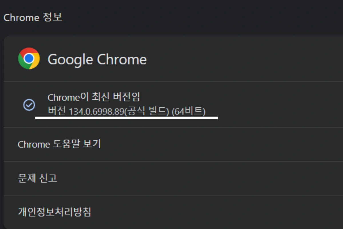 - 최신 버전: 버전 134.0.6998.89(공식 빌드) (64비트) 이상으로 업데이트해 주세요.