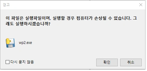 “파일 압축을 풀거나 실행할 경우 컴퓨터가 손상될 수 있습니다. 그래도 실행하시겠습니까? 경고창이 나옵니다. 실행 파일을 배포할 경우 이러한 경고를 표시할 수 있습니다. 바이러스는 포함되어 있지 않습니다.”