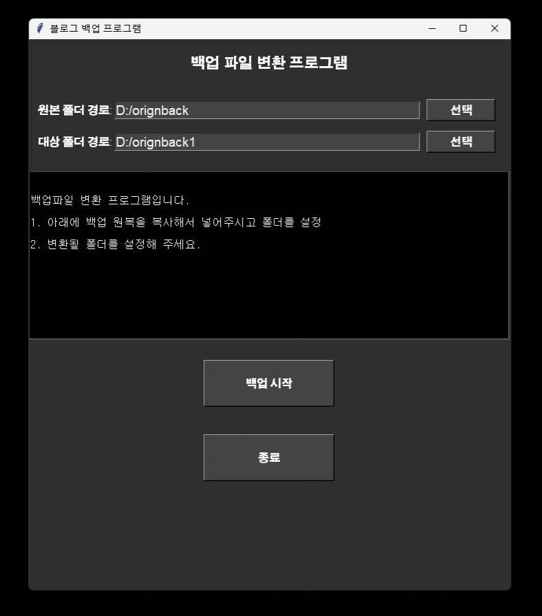 - 프로그램 실행: 프로그램을 실행하고, 백업 후 압축을 해제한 폴더를 선택합니다.