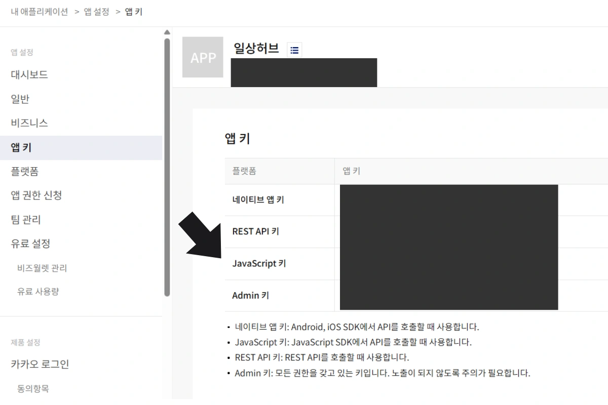 - 복사한 키를 Kakao.init(‘여기에_JavaScript_키’); 위치에 삽입