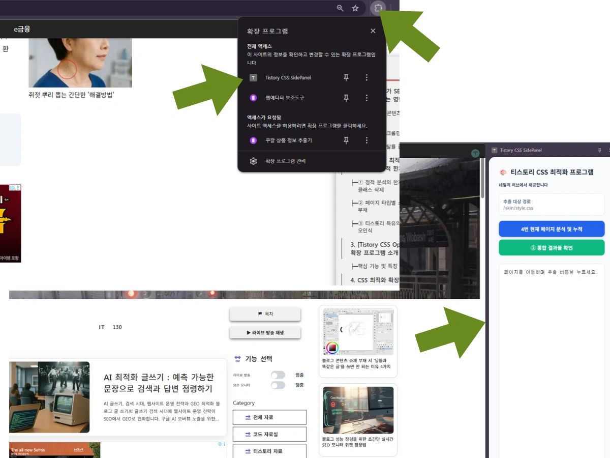 티스토리 블로그 속도가 느려 고민인가요? 수천 줄의 불필요한CSS를 클릭 몇 번으로 정리해주는 [Tistory CSS Optimizer] 확장 프로그램을 소개합니다. 실제 사용 중인 코드만 추출해 레이아웃 깨짐 없이 웹 성능과 SEO 점수를 완벽하게 개선해 보세요.