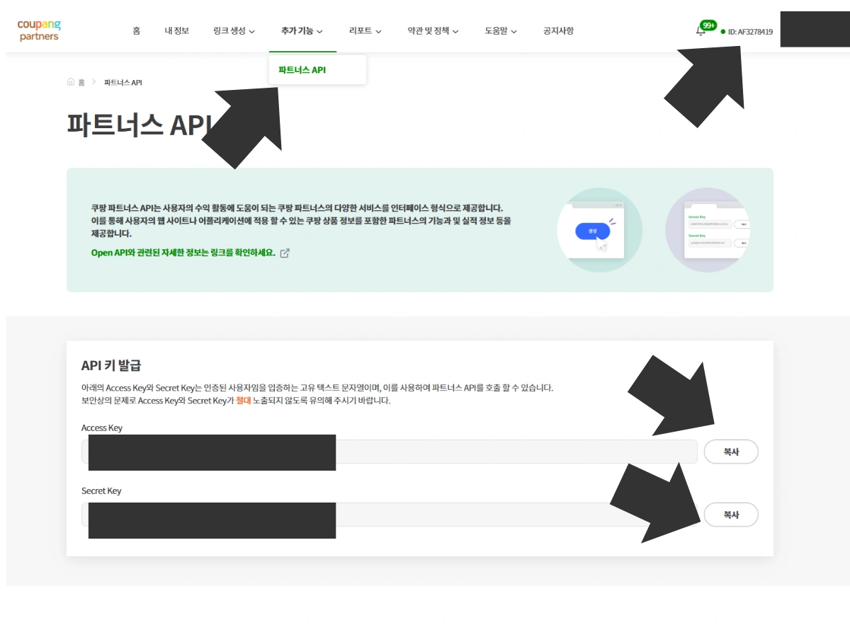 • 쿠팡 파트너스 로그인 API 관리 키 생성