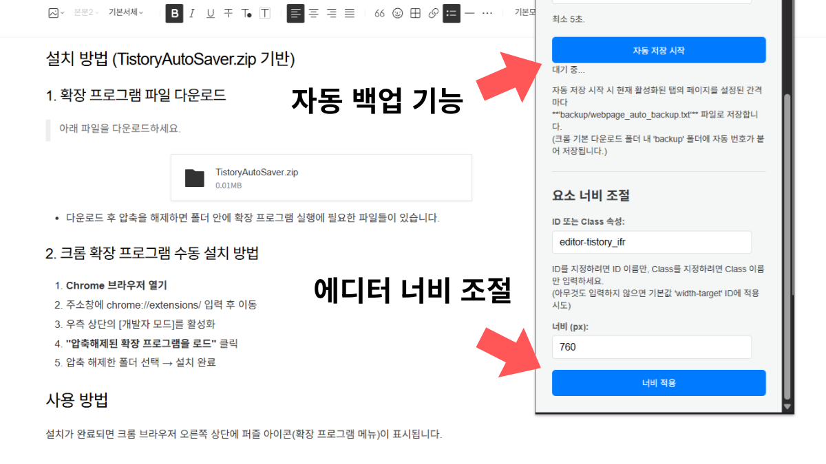 먼저 TistoryAutoSaver.zip 파일을 다운로드하고 압축을 해제한 뒤, 크롬 브라우저에서 개발자 모드 활성화 후 압축 해제된 확장 프로그램 로드를 통해 설치합니다. 설치 후 티스토리 글쓰기 페이지에서 확장 프로그램 아이콘을 클릭해 자동 저장과 너비 조절 기능을 사용할 수 있습니다.