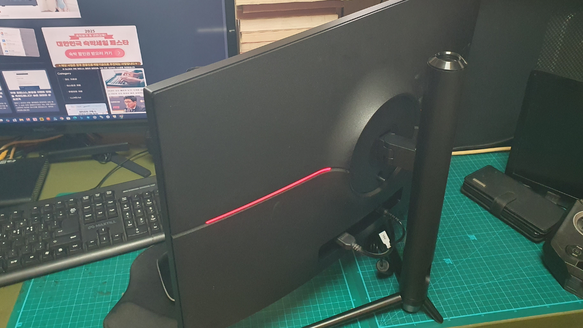 박스를 열고 제품을 꺼냈을 때 가장 먼저 눈에 들어온 것은 심플하면서도 게이밍 감성이 살아있는 디자인입니다. 얇은 베젤 덕분에 화면이 넓어 보이며, 스탠드는 안정적이고 높이와 각도 조절이 자유로워 최적의 사용 환경을 쉽게 설정할 수 있었습니다.