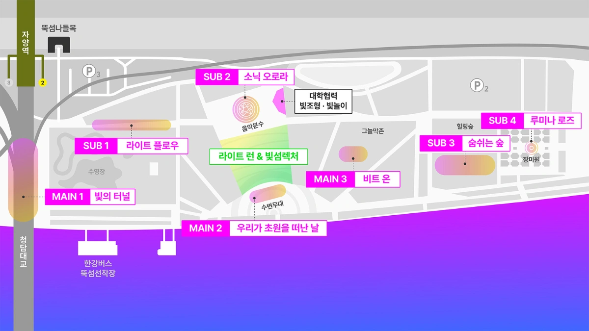 이번 축제에서는 대형 레이저쇼, 미디어 파사드, 음악 퍼포먼스 등 다채로운 프로그램이 준비되어 있으며, 한강 수변을 따라 걸으며 빛의 향연을 감상할 수 있는 특별한 경험을 선사합니다.