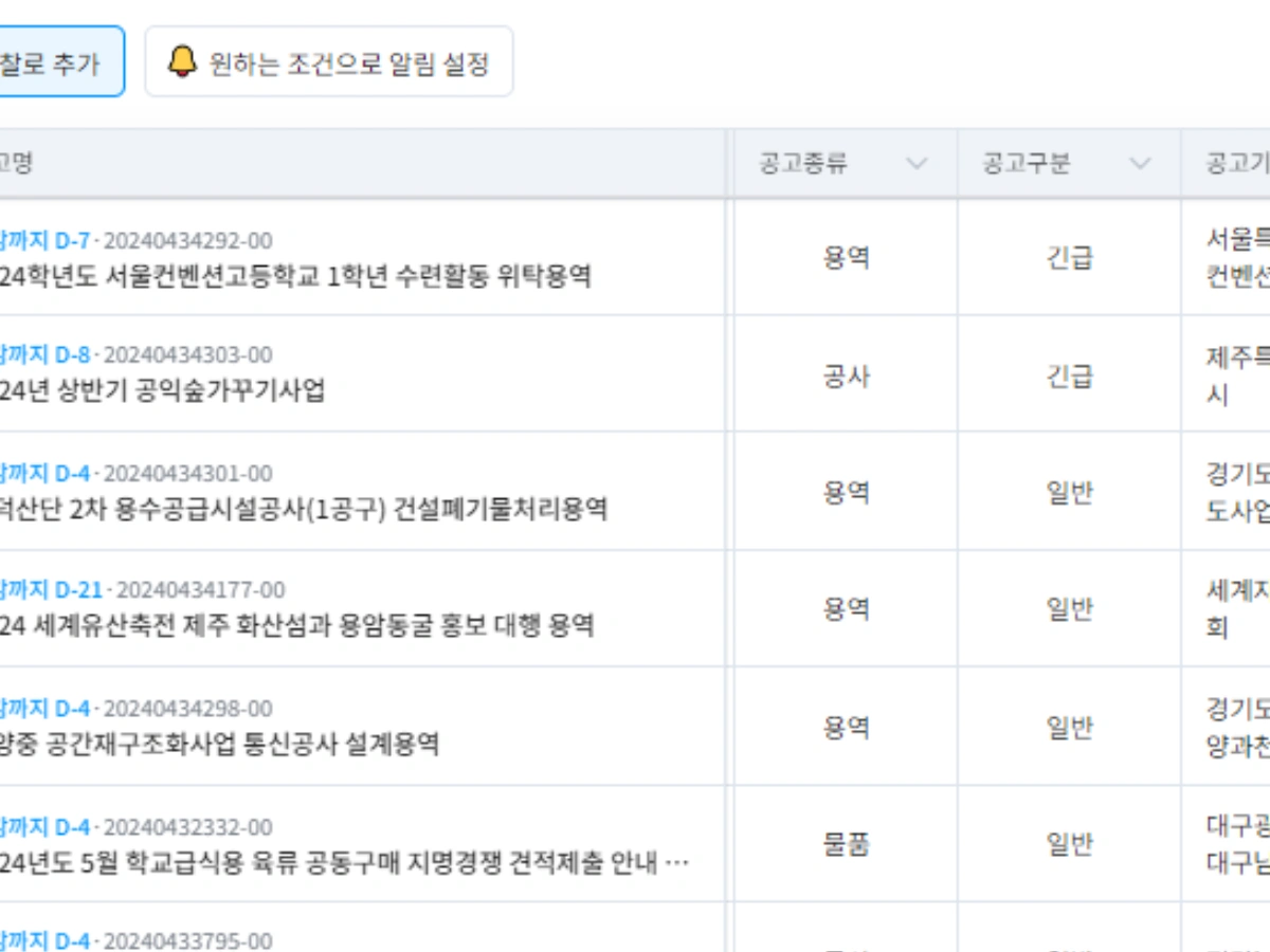 - 상세조건 활용: 추정금액, 업종, 지역 등 맞춤형 검색