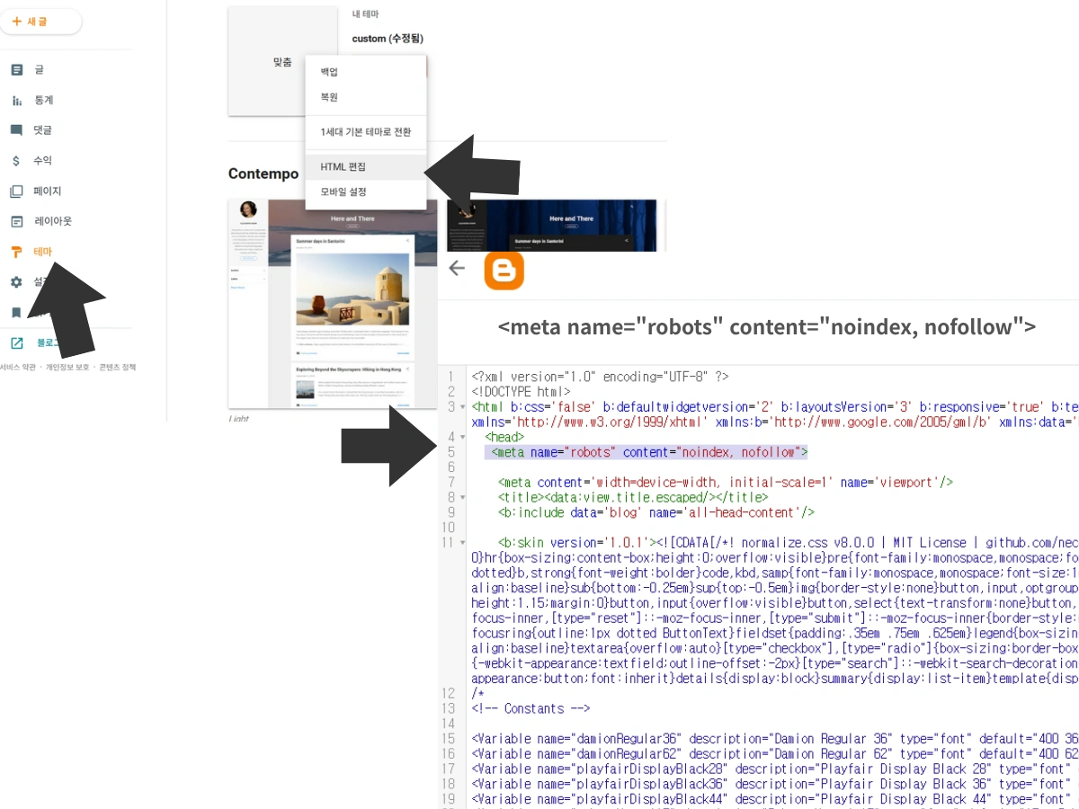 | 구글 블로그 (Blogger) | 완전 적용 가능 | HTML 편집과 head 접근이 자유로워 meta name=”robots” 삽입 가능, robots.txt 설정으로 색인 차단과 링크 크롤링 통제 가능 |