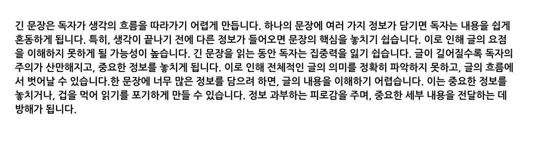 긴 문장은 독자가 생각의 흐름을 따라가기 어렵게 만듭니다. 하나의 문장에 여러 가지 정보가 담기면 독자는 내용을 쉽게 혼동하며, 문장의 핵심을 놓치기 쉽습니다. 이로 인해 글의 요점을 이해하지 못하게 될 가능성이 높습니다. 또한, 한 문장에 너무 많은 정보를 담는 것은 정보 과부하를 초래하여 독자에게 피로감을 주며, 중요한 세부 내용을 전달하는 데 방해가 됩니다.