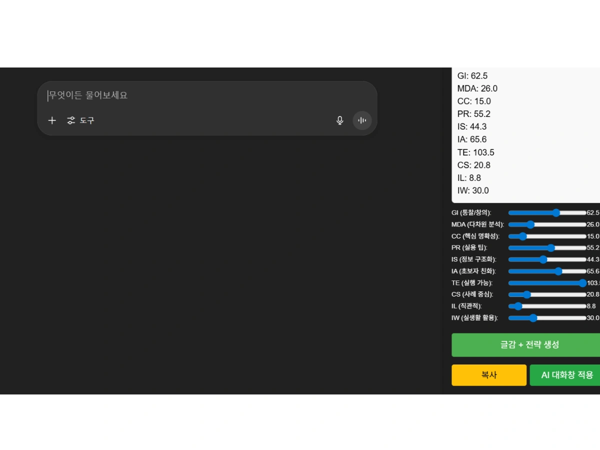 이 과정을 통해 질문은 단순 요청에서 지적 설계 행위로 진화합니다. 즉, 단순 질문이 출력 중심 사고라면, 공식화된 프롬프트는 설계 중심 사고입니다. 이 차이가 AI 글작성의 성공과 실패를 가릅니다.