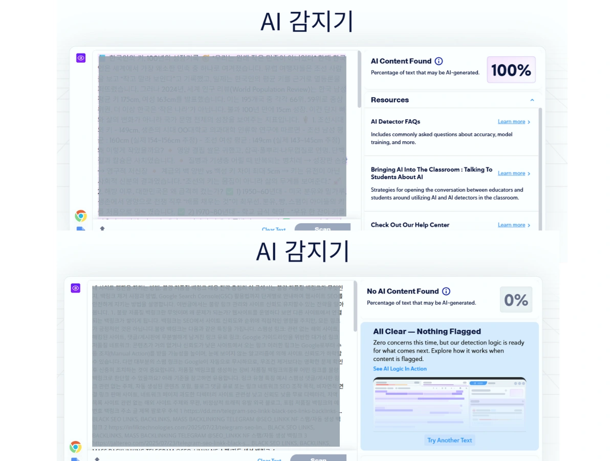 다들 아시다시피 요즘 검색엔진은 지금 우리가 사용하는 AI의 할아버지 뻘쯤 되어서 금방 알아요, AI가 작성했다는 걸~